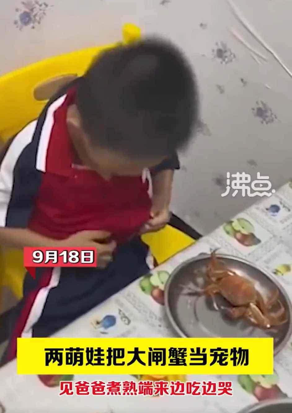 9月21日,據中國新聞周刊援引沸點視訊報道,近日,在廣東佛山,兩個萌娃把大閘蟹當寵物,見爸爸把大閘蟹煮熟端來,兩個萌娃邊吃邊哭,哭得聲嘶力竭。