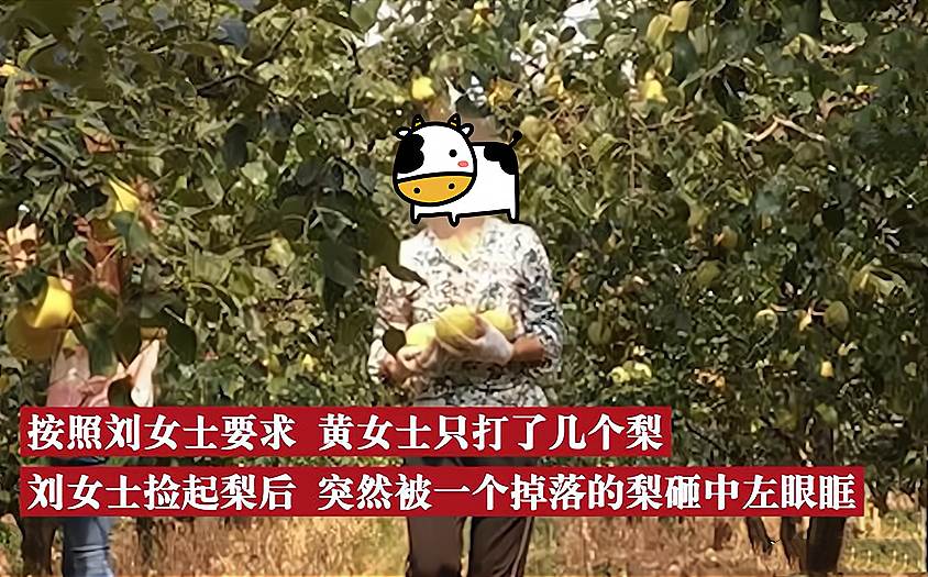 劉女士將打落在地的梨子撿起來,誰知她撿起梨后突然被一個掉落的梨砸中左眼眶,疼痛不已。