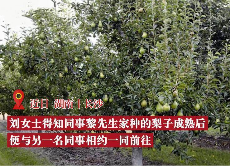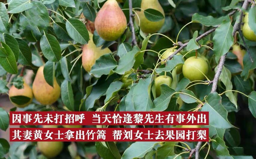 當天,劉女士沒打招呼就來到黎先生家摘梨,因為沒有提前通知,黎先生根本不知道這件事,也恰好不在家中,是他的妻子黃女士接待了她。
