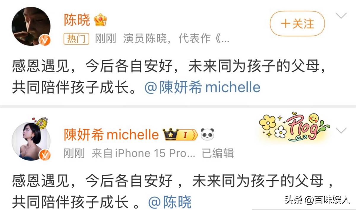 當天中午,陳曉和陳妍希突然發文:「感恩遇見,今后各自安好,未來同為孩子的父母,共同陪伴孩子成長。」