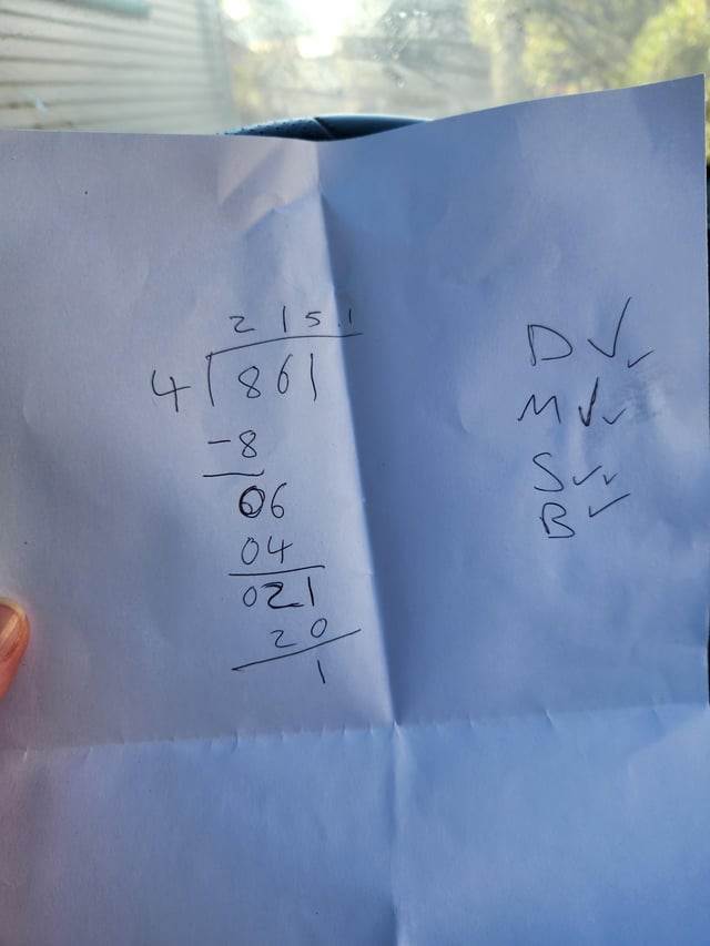 英國一名父親日前在Reddit發文表示,自己在教國小孩子數學作業時遇到難題,白紙上清楚寫著「861÷4」的長除法(也稱為直式除法)算式,也依循著常見的DMSB操作口訣(Divide除、Multiply乘、Subtract減、Bring down下移)逐步計算,但最後答案卻與正解不同。