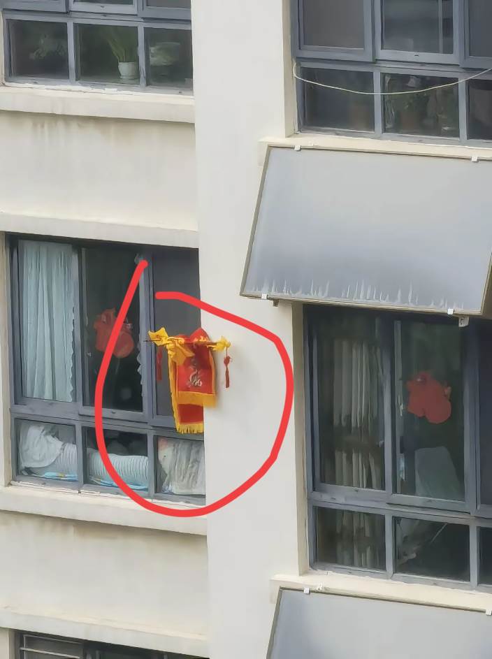 中午時分,陽光透過窗戶灑進屋內,市民李女士正坐在窗邊發愣,目光不經意間掃向對面樓棟,卻被眼前一幕驚得心頭一緊 —— 對面一戶人家的窗戶上,掛著一面樣式奇特的旗子。