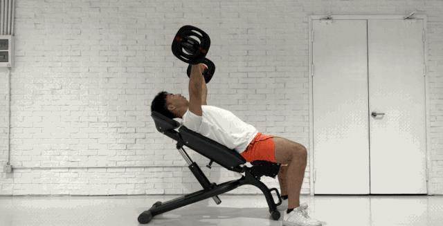 動作一,上斜啞鈴臥推,每組做8-12次,做4組