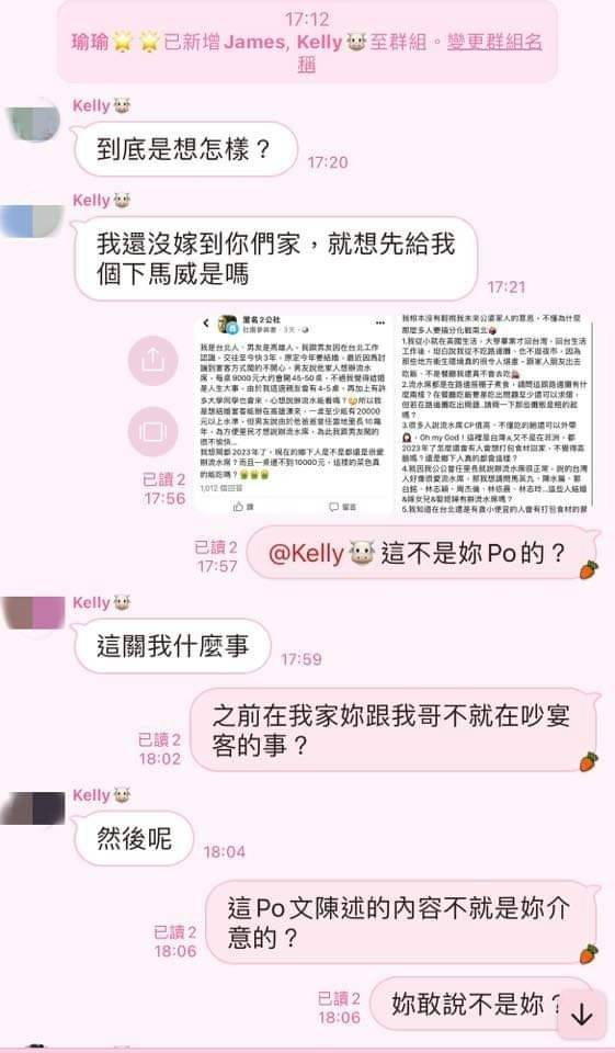 女方則表示「給我下馬威?」、「嫁到你家這些是我應得的」、「那就退婚啊」、「丟臉的是你們!」