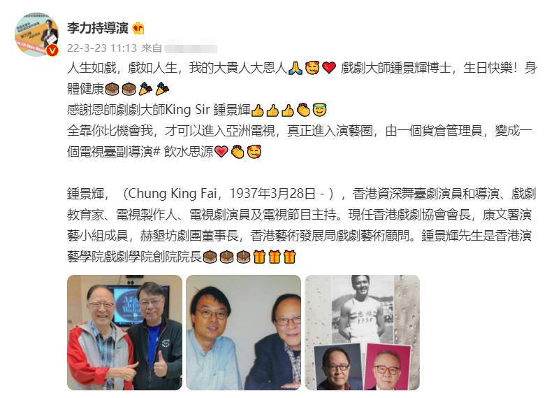 李力持寫道,人生如戲,戲如人生,我的大貴人大恩人戲劇大師鐘景輝博士,生日快樂,身體健康。