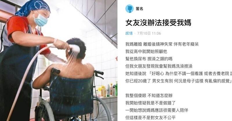 男網友表示,他的媽媽因為失婚後產生了精神問題和老年癡呆癥,而他從高中就一直在照顧她,包括換尿布和擦澡等工作。然而,他的女友對此十分不理解,他認為自己的媽媽需要有人陪伴,但也擔心這樣做是否對女友不公平。他希望網友能給些建議。